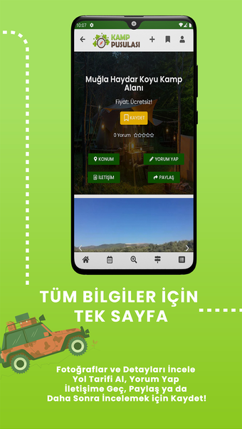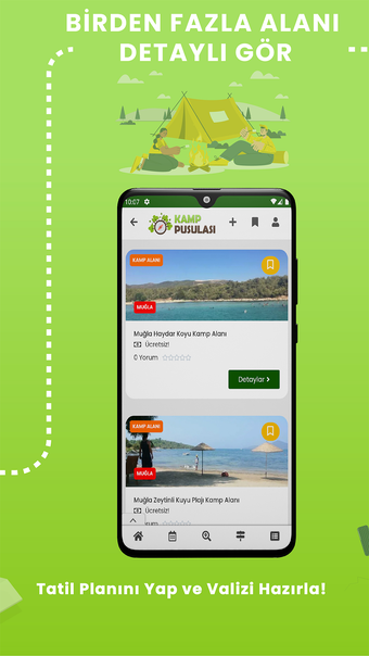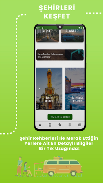 이 앱은 유료/무료 캠프장, 별장, 캐러밴 사이트, 관광지, 이벤트, 투어 및 가이드 블로그를 포함한 포괄적인 여행 관련 정보 목록을 제공합니다. 여행을 위해 결정한 지점을 저장하여 여행 계획을 세우고 다른 사람들과 공유하는 것이 더욱 쉬워집니다. 도시 안내서 기능은 터키의 모든 주에 대한 관심 지점에 대한 상세한 정보를 제공합니다.
